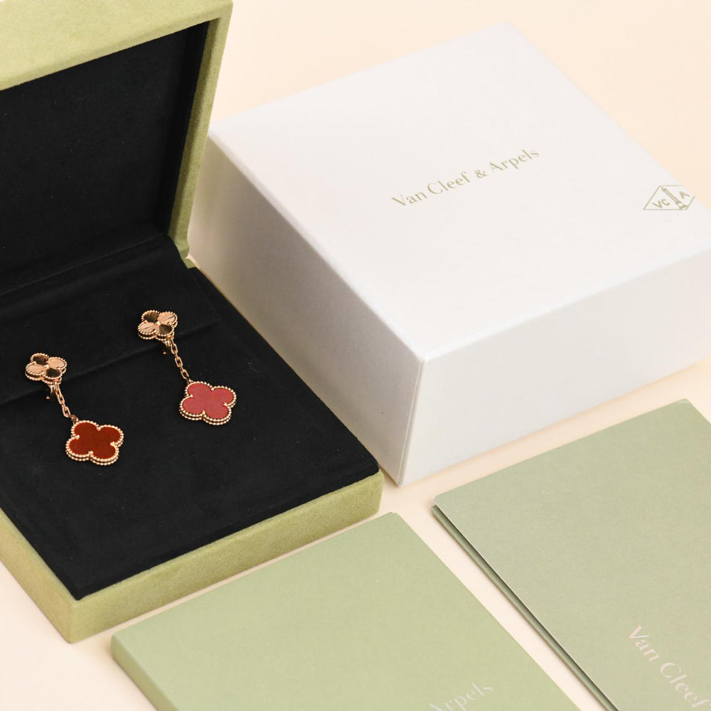 Released exclusively between 2012 and 2013 for a select group of VIP clients, this Van Cleef & Arpels Limited Edition Byzantine Lucky Alhambra Carnelian 18K Rose Gold Necklace. brings together three of the Maison’s most iconic collections: Byzantine, Lucky, and the timeless Alhambra. The result is a beautifully balanced design that celebrates nature, elegance, and heritage all in one piece.