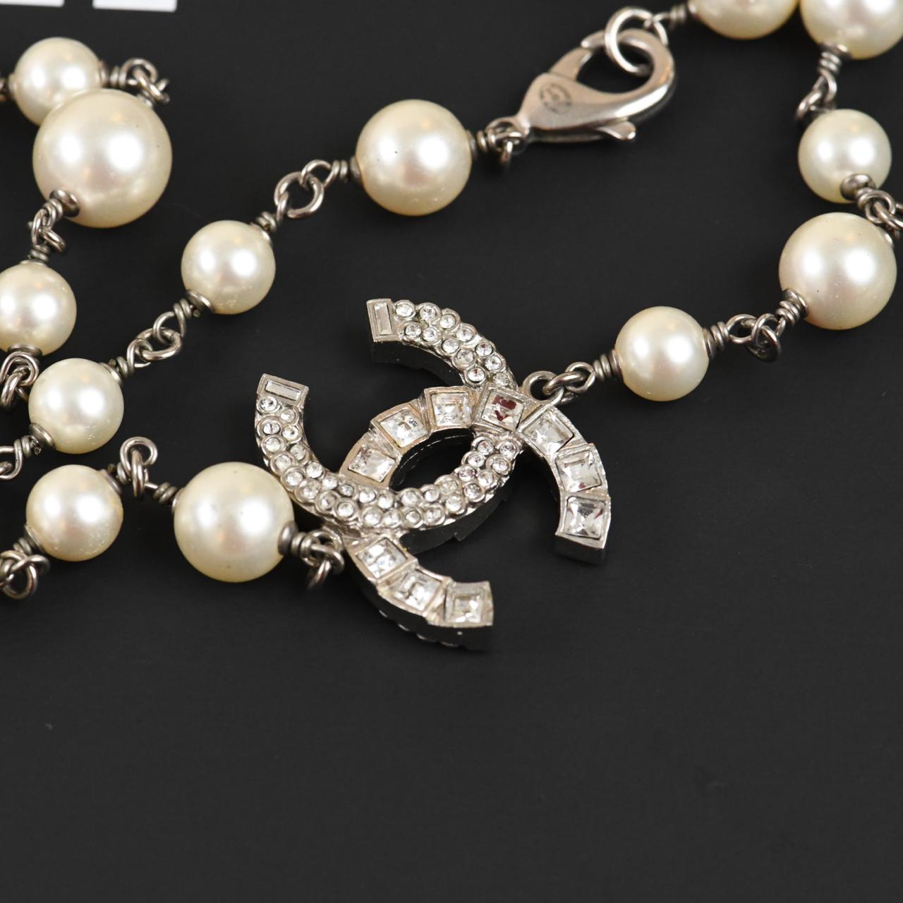 Chanel CC Three Logos Sautoir Necklace Faux Pearl Crystal
