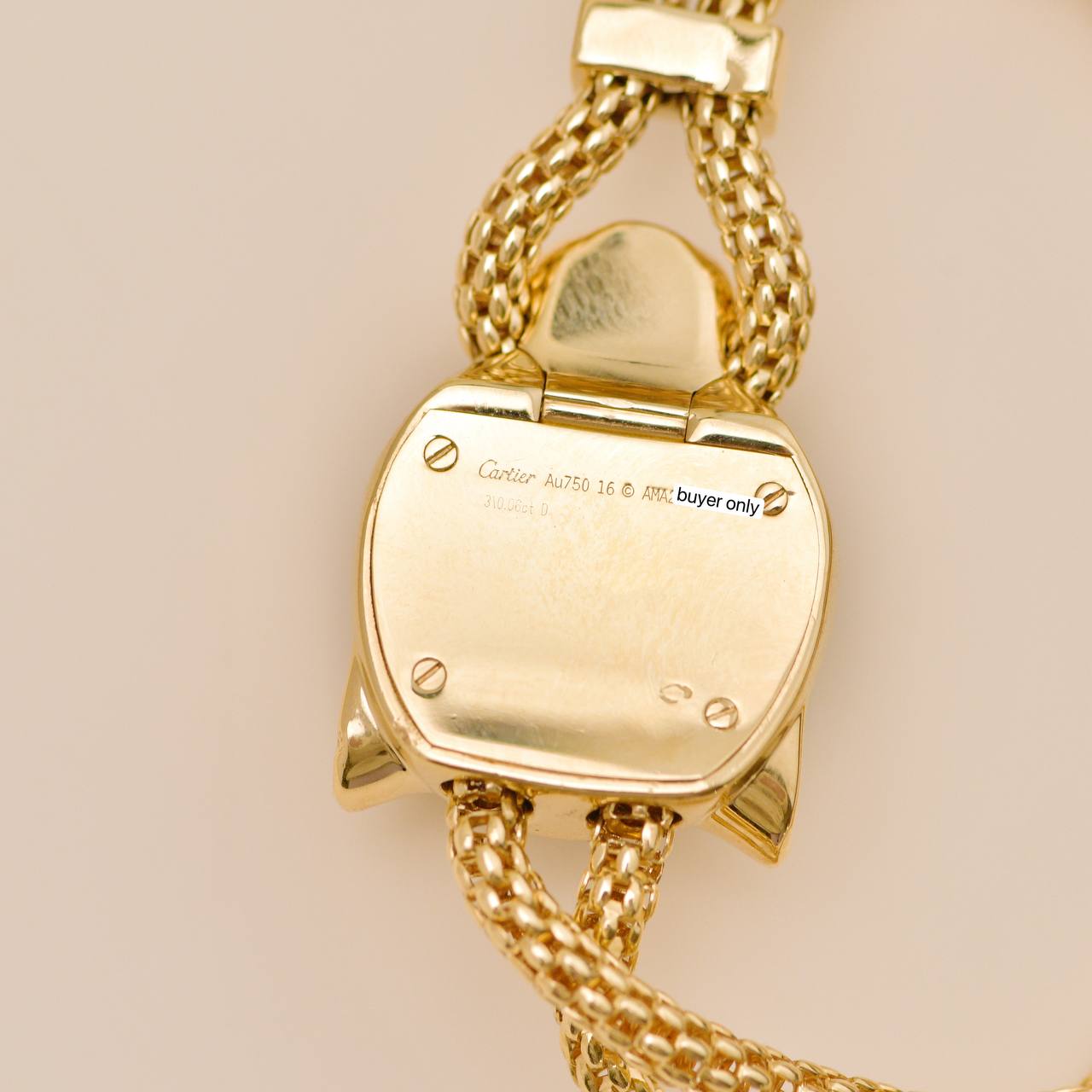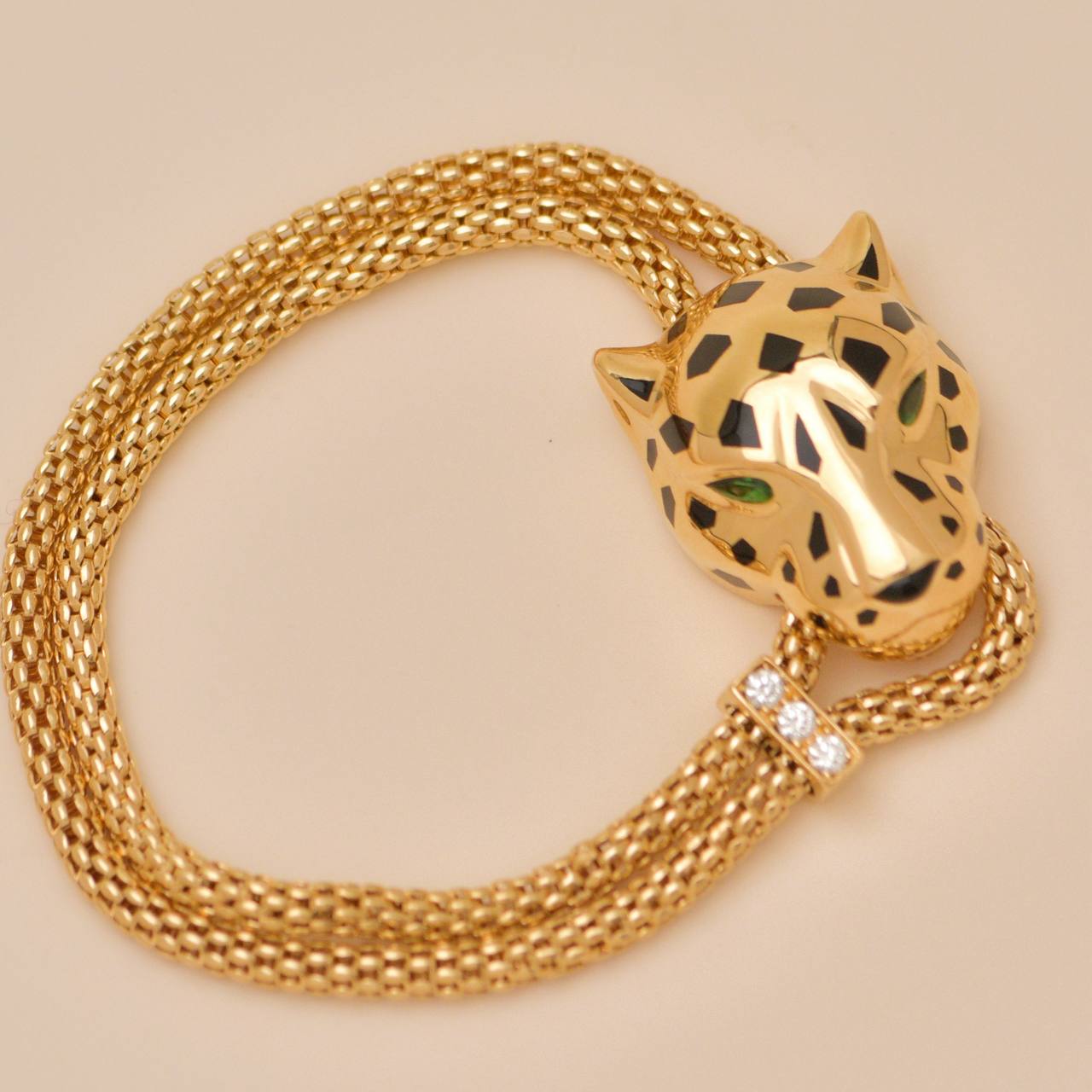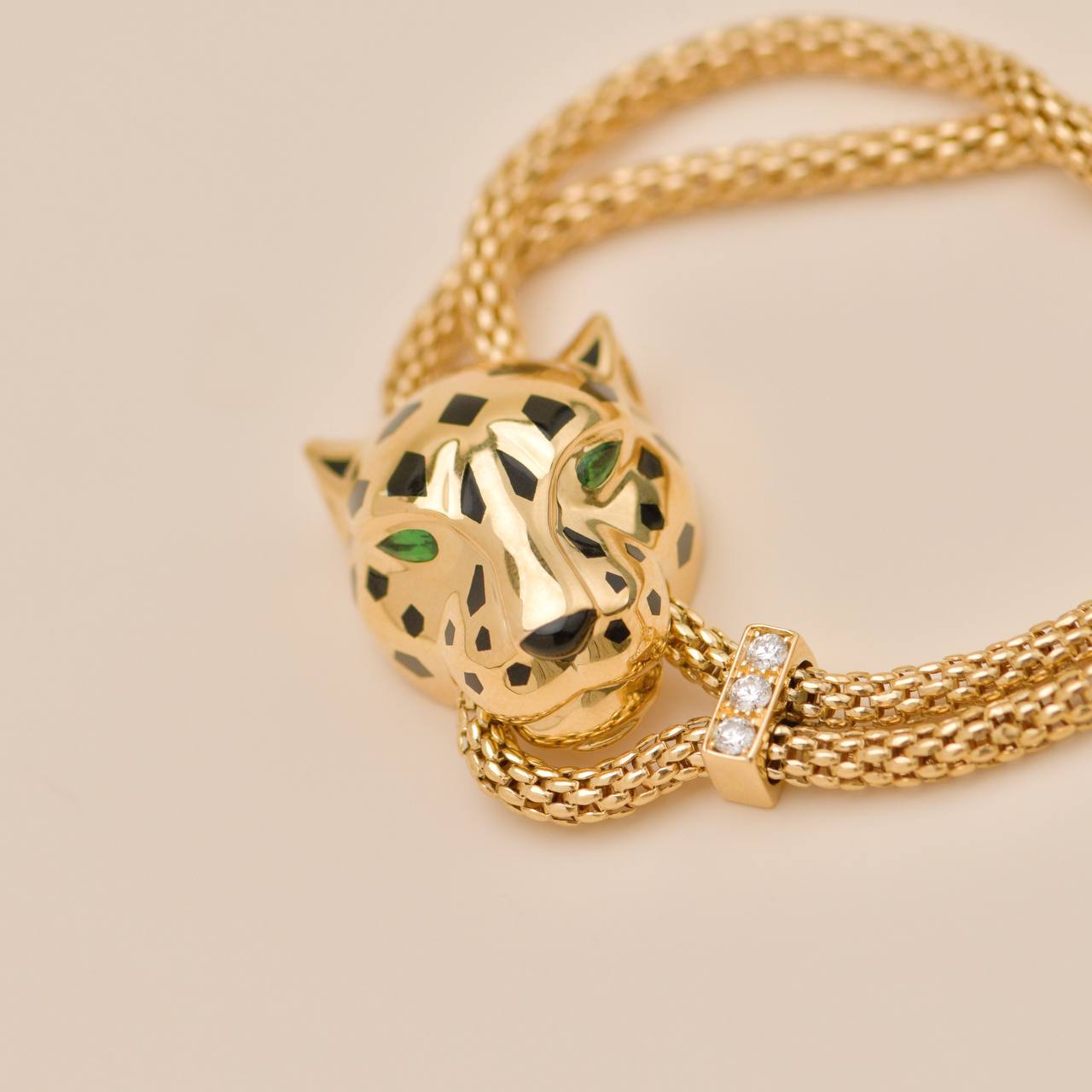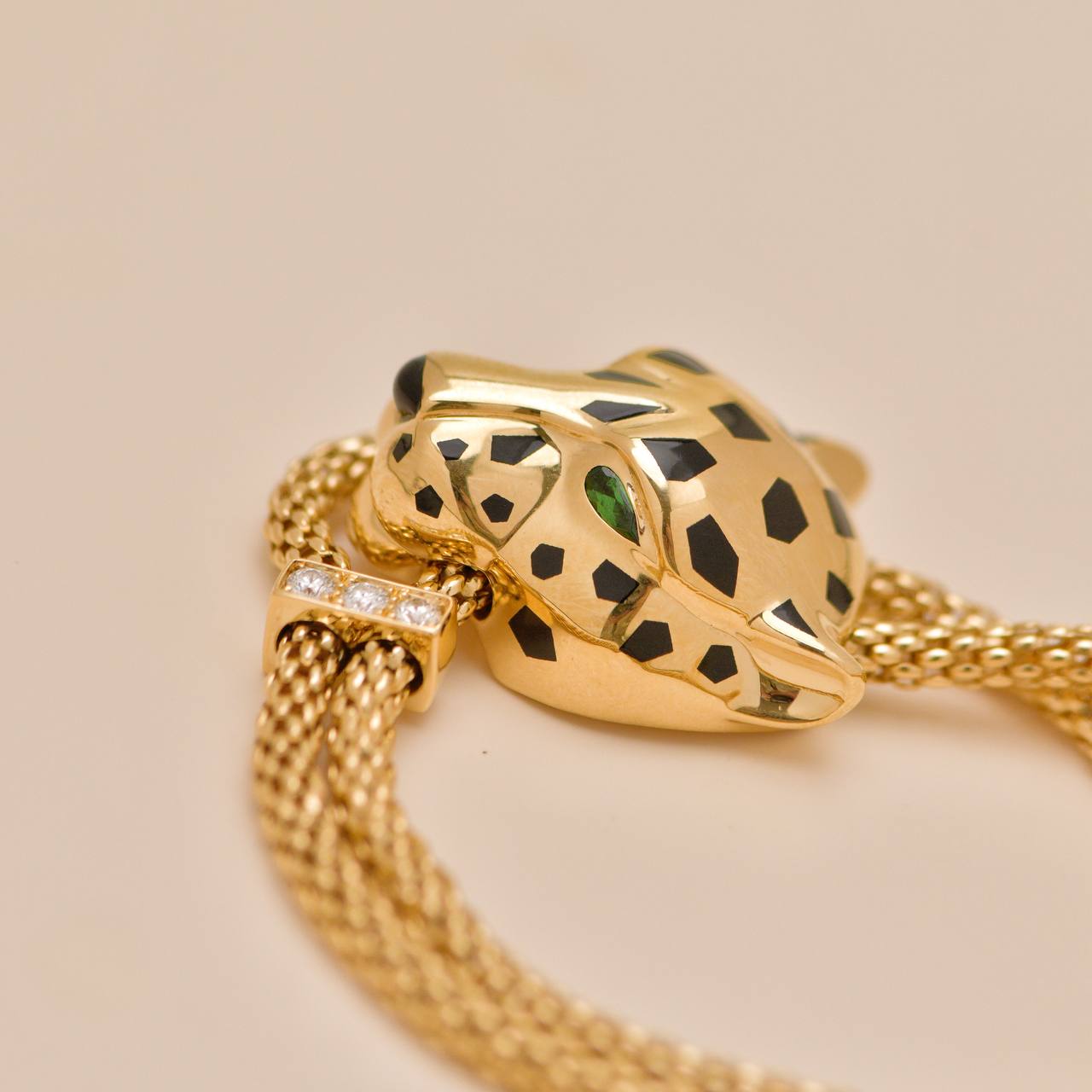 Authentic Preowned Cartier Panthère Bracelet in 18K yellow gold, presented as a full set and designed with striking black lacquer, vibrant tsavorite garnets, and brilliant-cut diamonds; representing power, confidence, and timeless allure, the iconic panther motif is one of Cartier’s most celebrated designs, making this piece a distinctive choice for collectors and those seeking bold, luxury jewellery with meaning and unmistakable style, and can be worn alone as a statement piece or layered with other fine bracelets for a more curated, contemporary look.