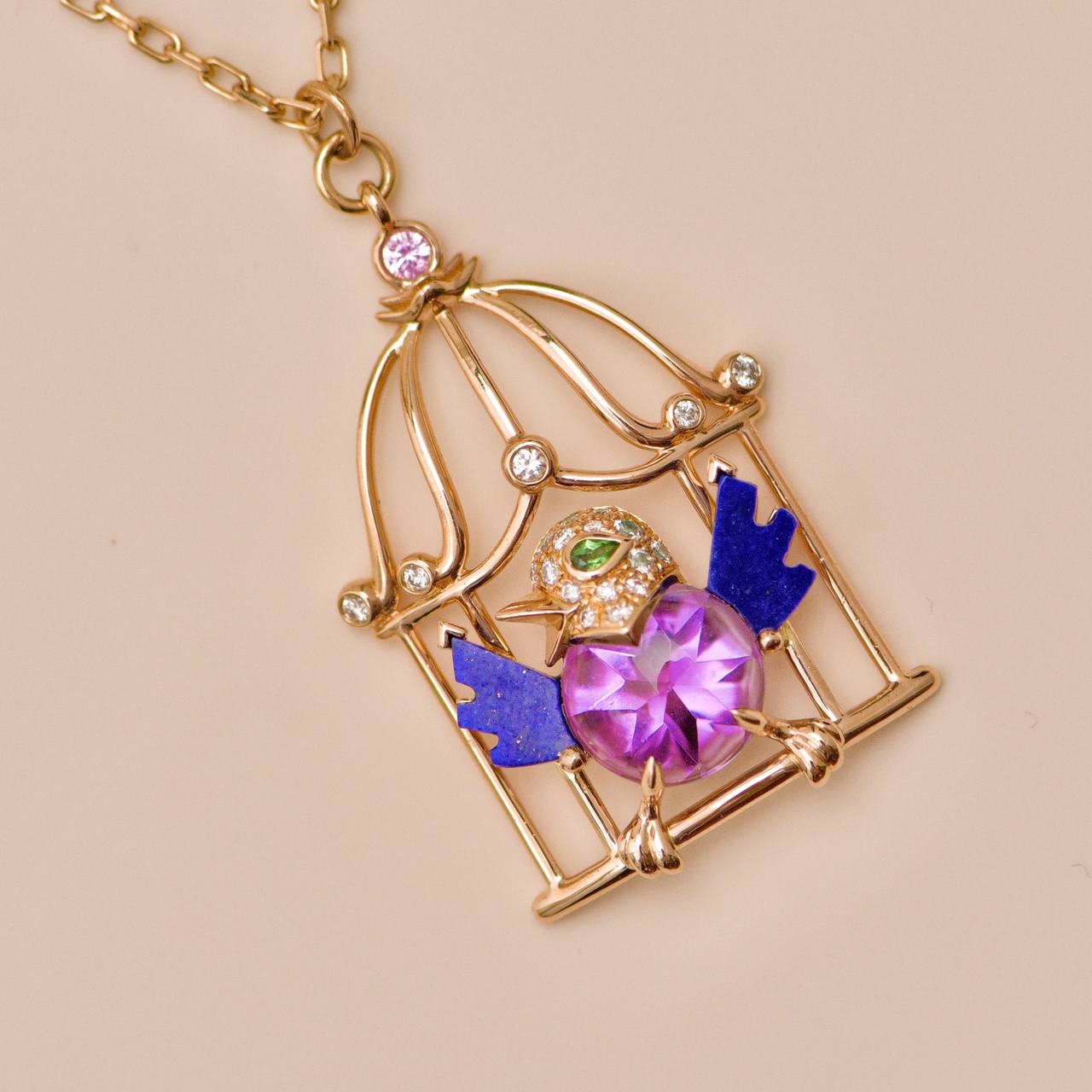 Preowned Authentic Full set Cartier Free As A Bird necklace crafted in 18K Rose Gold, set with Diamonds, Amethyst, Lapis Lazuli and Peridot. The pendant features a sculpted bird poised within an openwork cage motif.