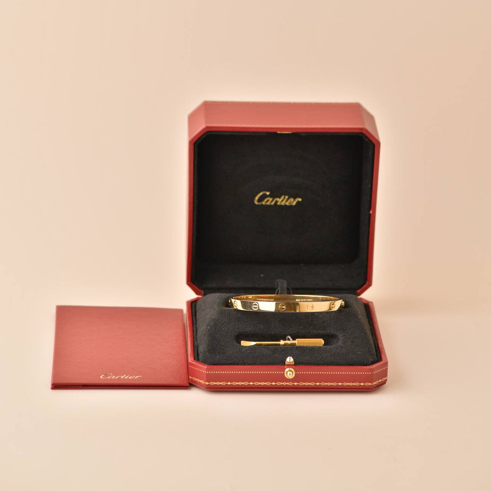 This preloved Cartier Love 18K Yellow Gold Bracelet Size 20 is a full set with a Cartier box, Cartier certificate of authenticity and iconic screwdriver. This is the classic design, with the updated screw system.