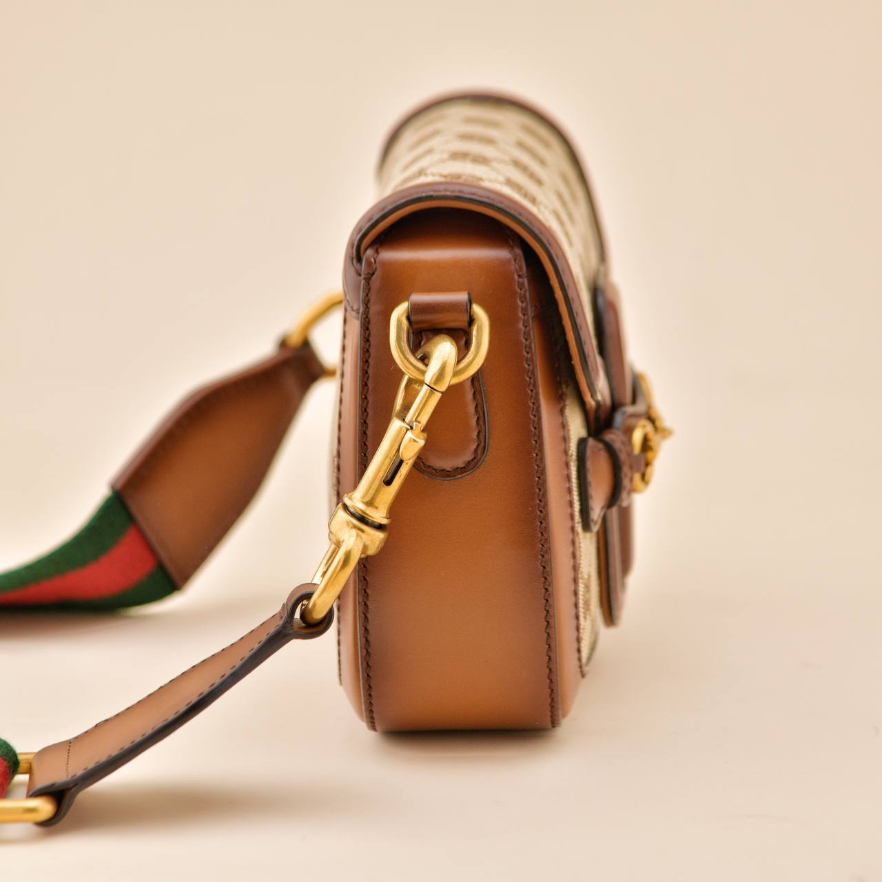 Preloved Gucci Lady Web Shoulder Bag crafted in beige GG Supreme canvas with rich brown hand-stained leather trim. Features gold-tone Horse-bit hardware and a detachable Web strap for a classic yet versatile look. A timeless luxury designer handbag, perfect for everyday wear or collectors.