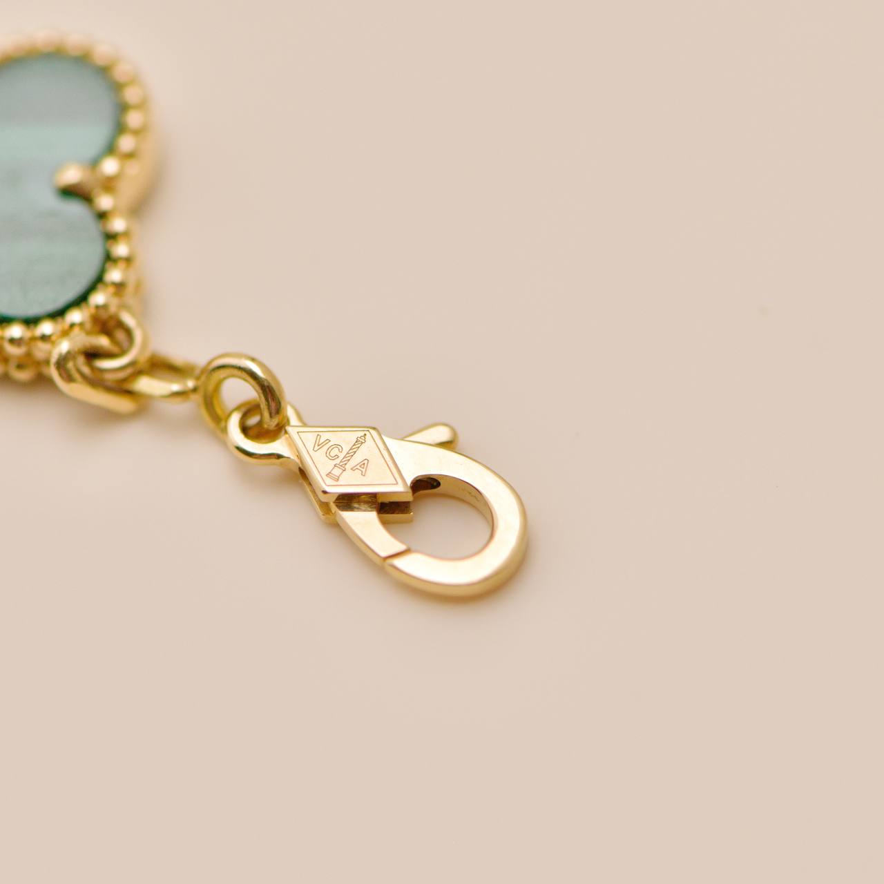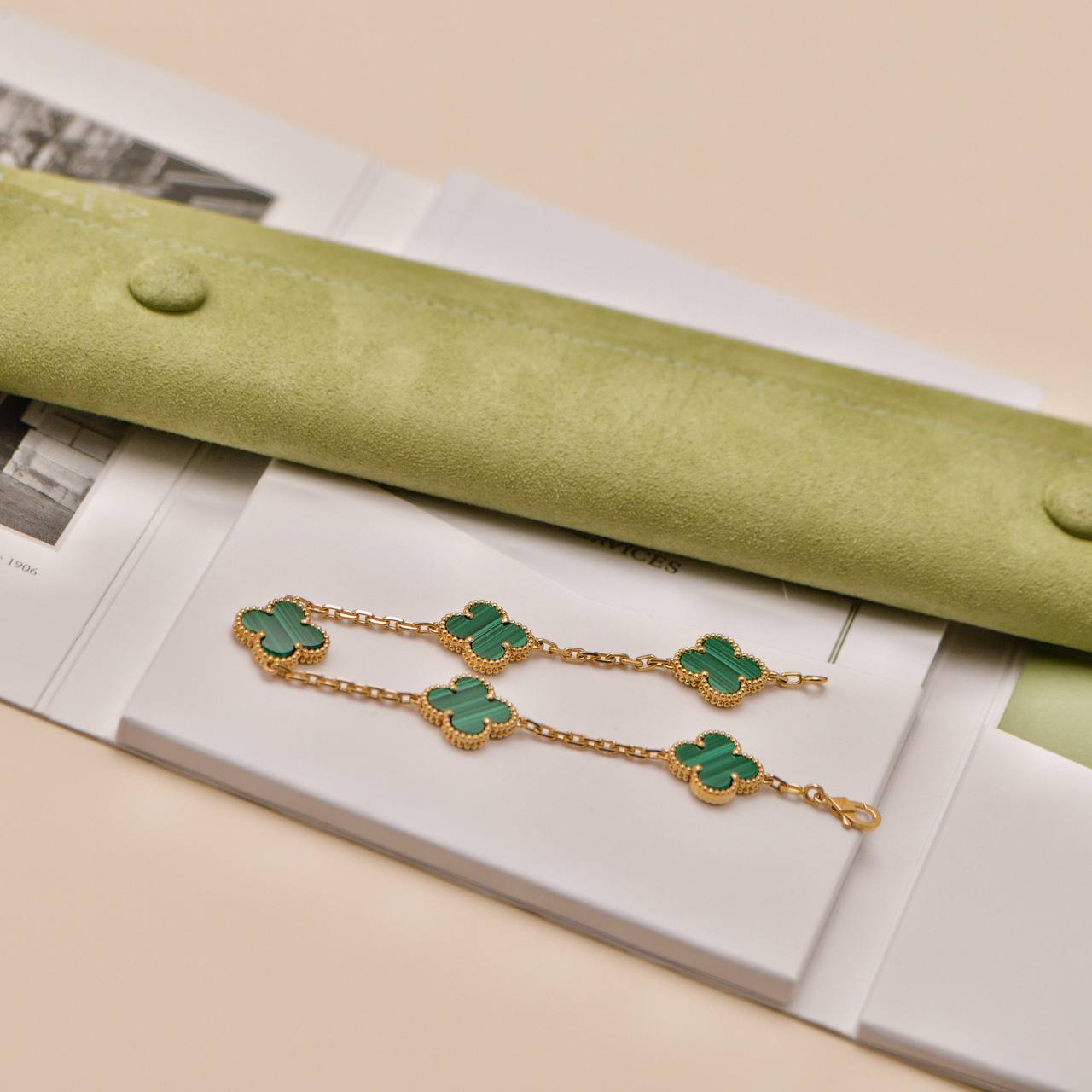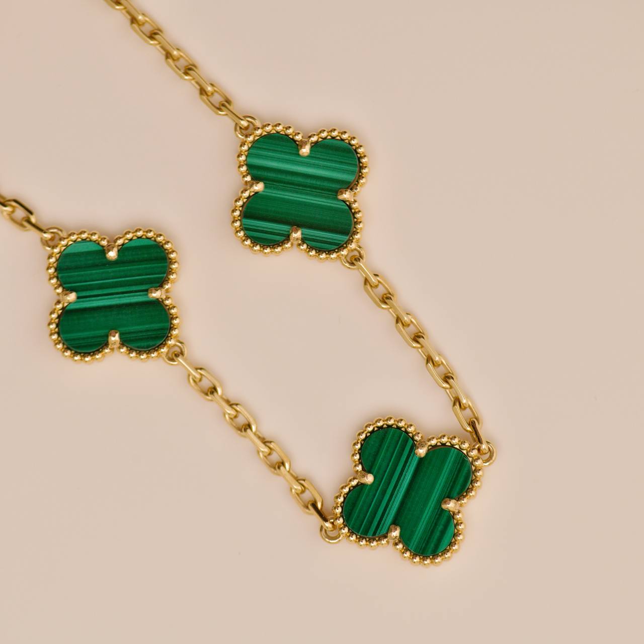 Authentic Preowned Full set Van Cleef Vintage Alhambra bracelet in malachite and 18K yellow gold, featuring five iconic clover motifs. A timeless and elegant piece from the Alhambra collection, perfect for everyday wear alone or stacked with other bracelets for a chic layered style.