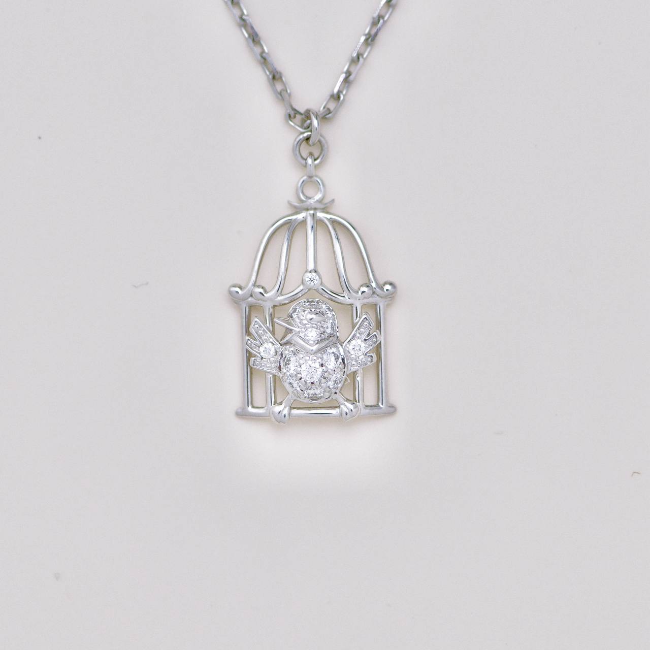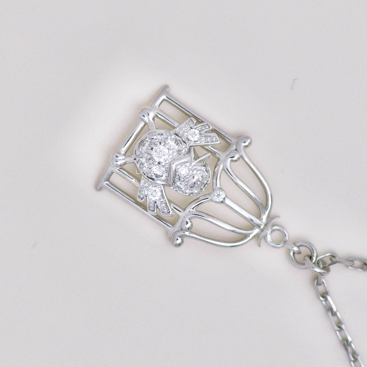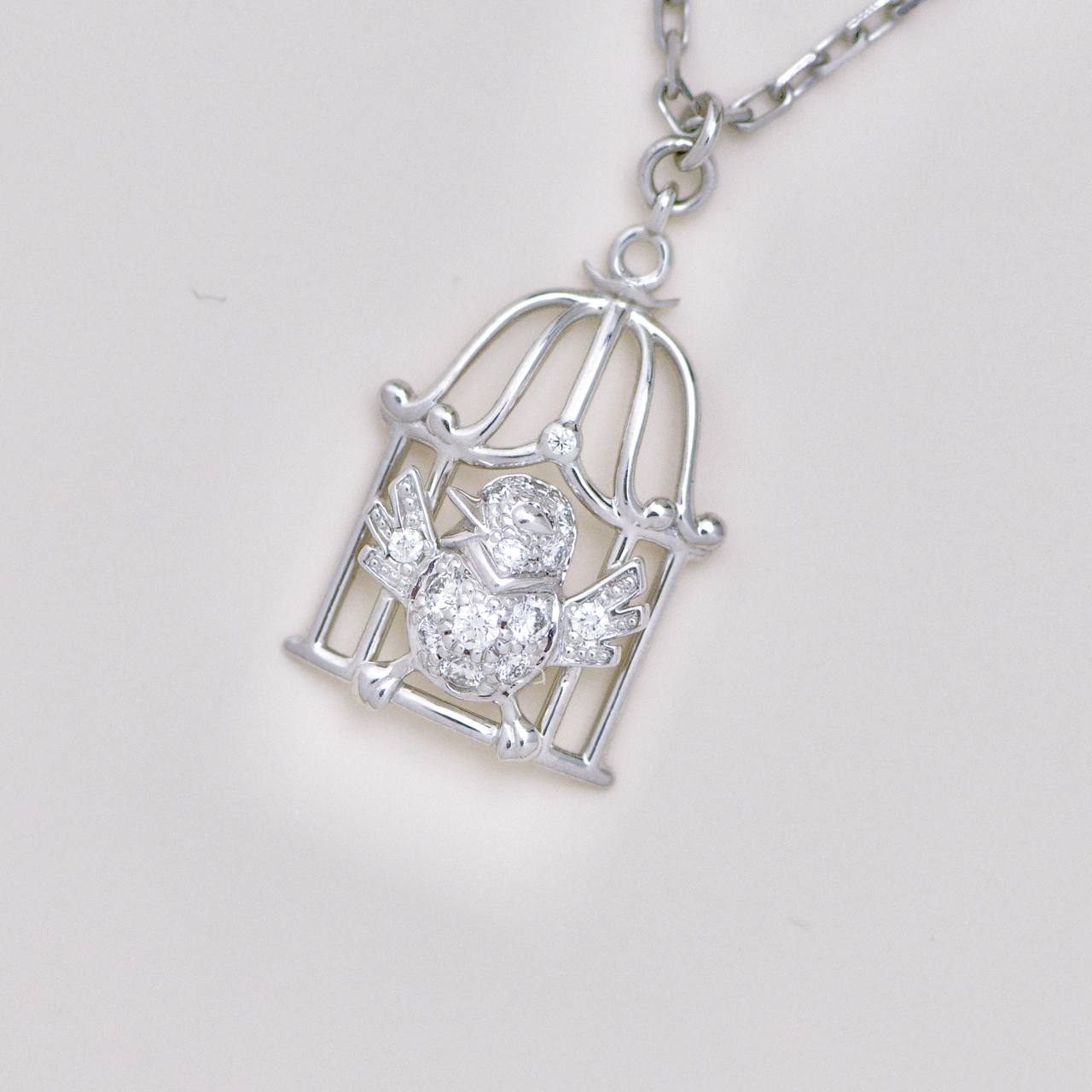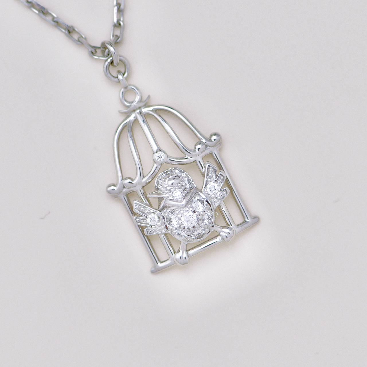 Pre-owned Authentic Full set Cartier Free As A Bird diamond necklace crafted in 18K white gold, featuring a sculpted bird poised within an openwork cage motif set with brilliant-cut diamonds.
