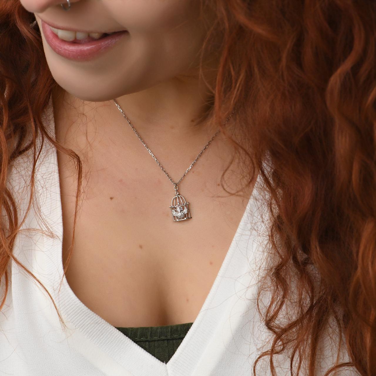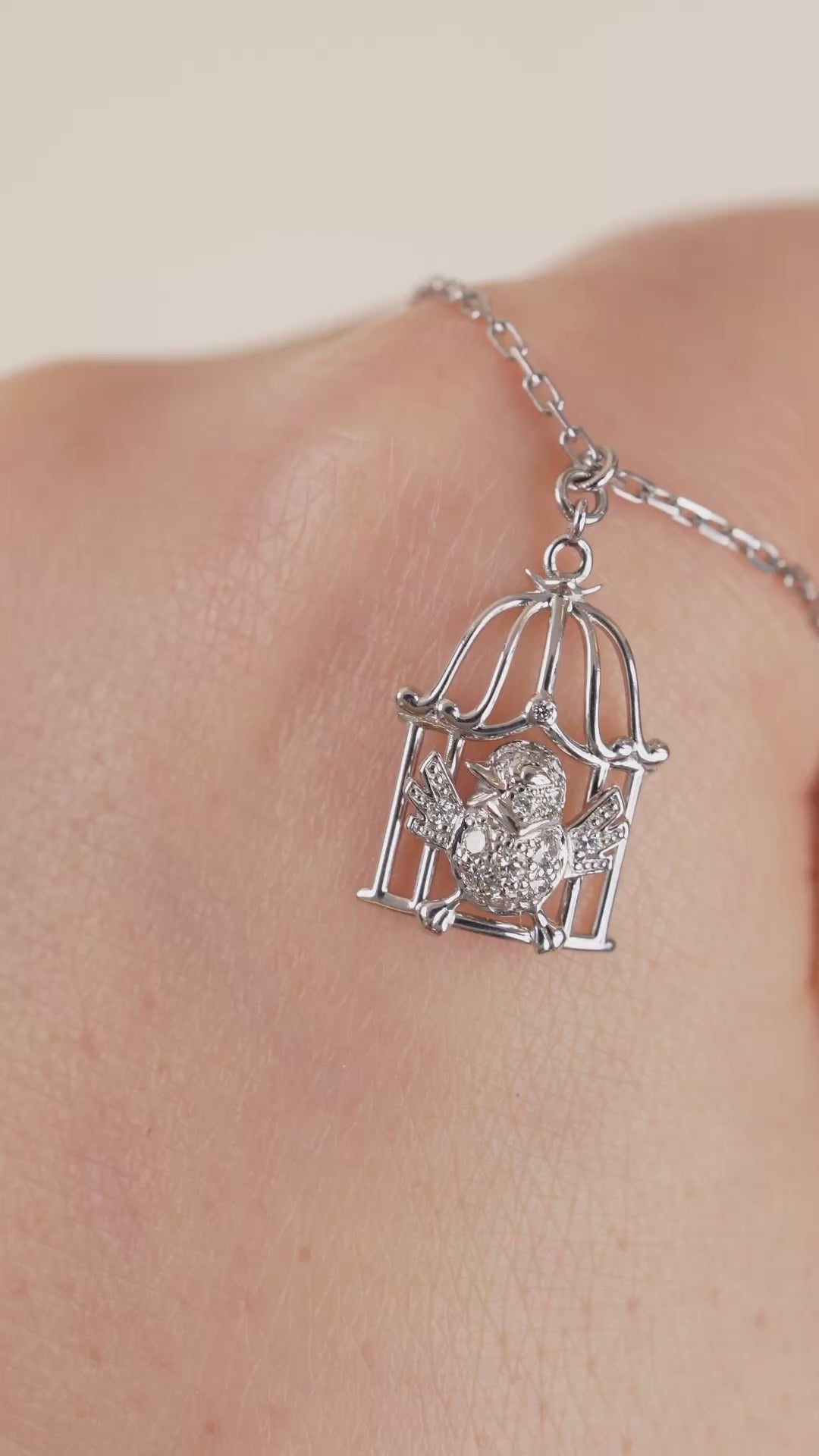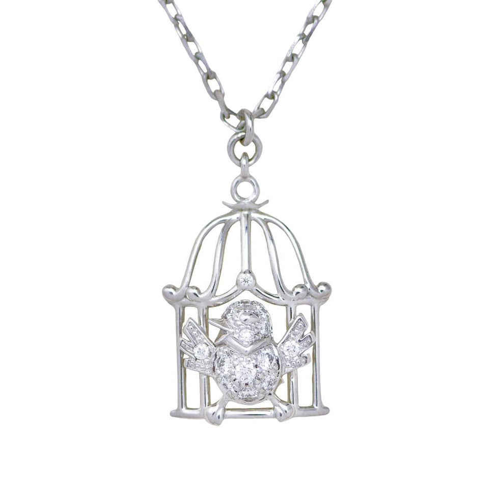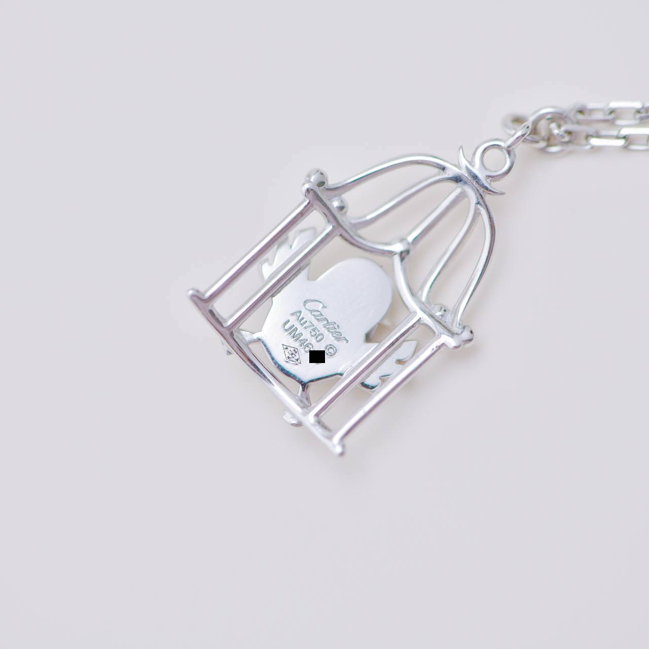 Pre-owned Authentic Full set Cartier Free As A Bird diamond necklace crafted in 18K white gold, featuring a sculpted bird poised within an openwork cage motif set with brilliant-cut diamonds.