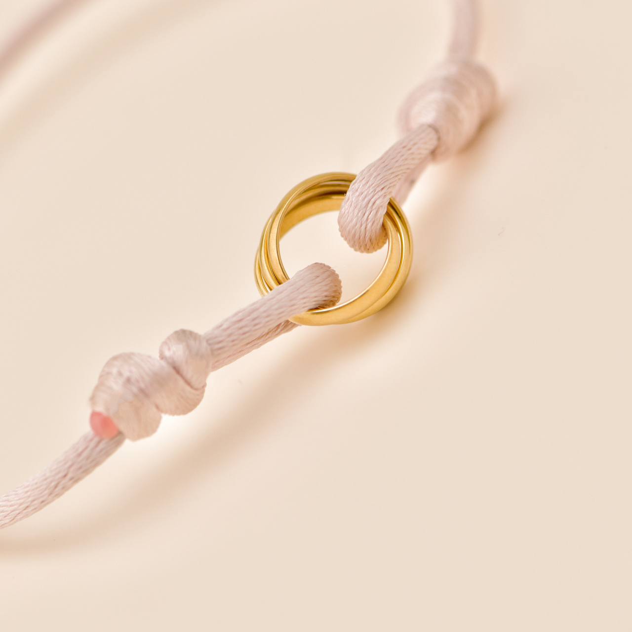 Full set Cartier Trinity cord bracelet featuring the iconic Trinity rings in 18K yellow gold, finished with a pink cord. A refined and minimalist design, suitable for everyday wear, worn alone or layered with other fine gold bracelets.