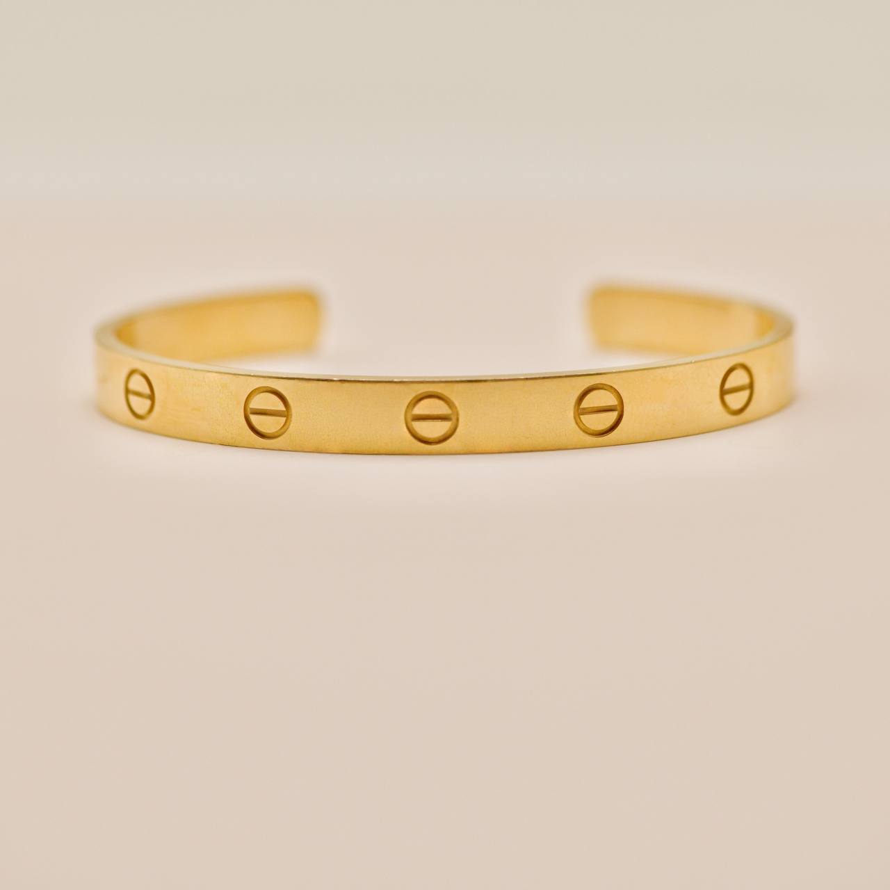 Preowned Authentic Full set Cartier Love Cuff Bracelet 18K Yellow Gold, Size 17. A timeless symbol of commitment and style. Featuring the iconic screw motif, the open cuff design makes it easy to wear and comfortable on the wrist. Perfect worn alone for a refined look or stacked with other Love bracelets.