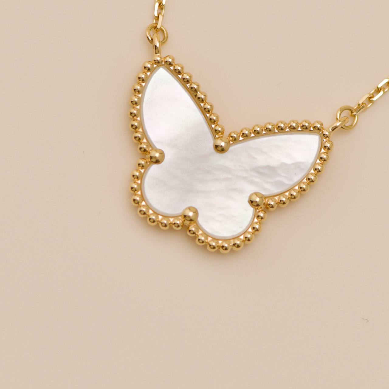 Full set Authentic Van Cleef Lucky Alhambra butterfly pendant necklace in mother of pearl, crafted in 18K yellow gold. A delicate and timeless design that can be worn alone for an elegant everyday look, or layered with other fine gold necklaces for a modern, refined style.