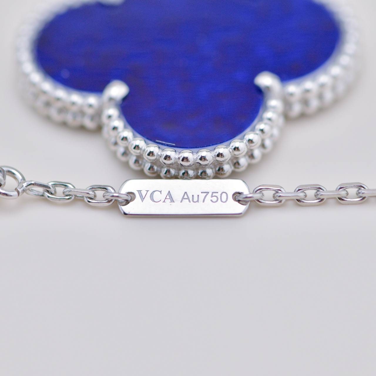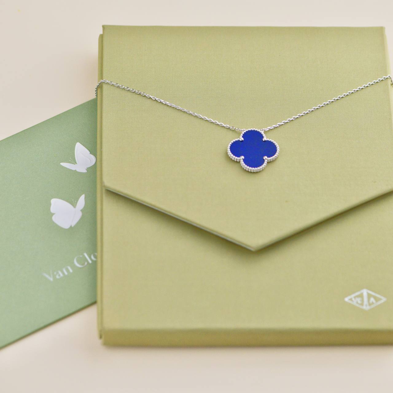 Authentic Full set Van Cleef Magic Alhambra Necklace, crafted in 18K white gold and featuring the highly sought-after blue Sèvres porcelain motif. This exceptional piece is offered as a full set and is a rare find on the resale market, prized for its distinctive colour, refined craftsmanship, and collectable appeal.