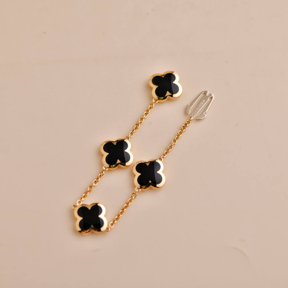 Elevate your elegance with this Van Cleef & Arpels Pure Alhambra Bracelet, a timeless piece crafted from 18K yellow gold. This stunning bracelet features exquisite black onyx motifs, each measuring approximately 1.5 cm in diameter, perfectly contrasted against the warm hue of the yellow gold. Weighing approximately 16.1 grams and a length of approximately 18cm.
